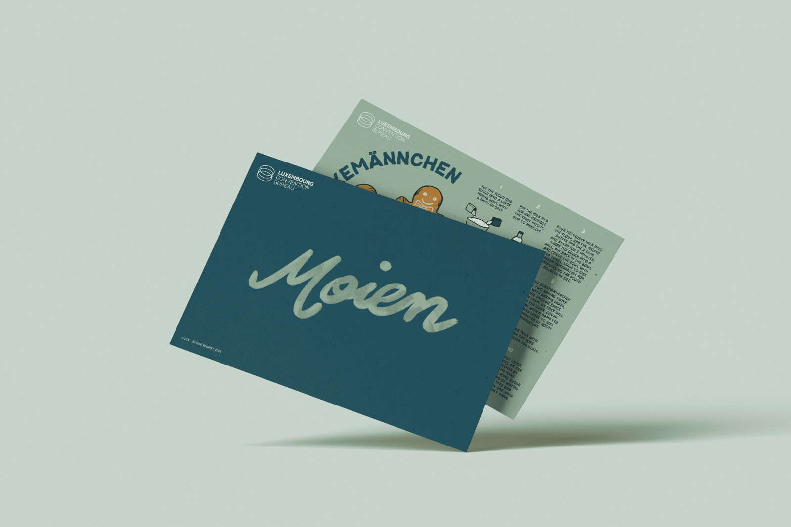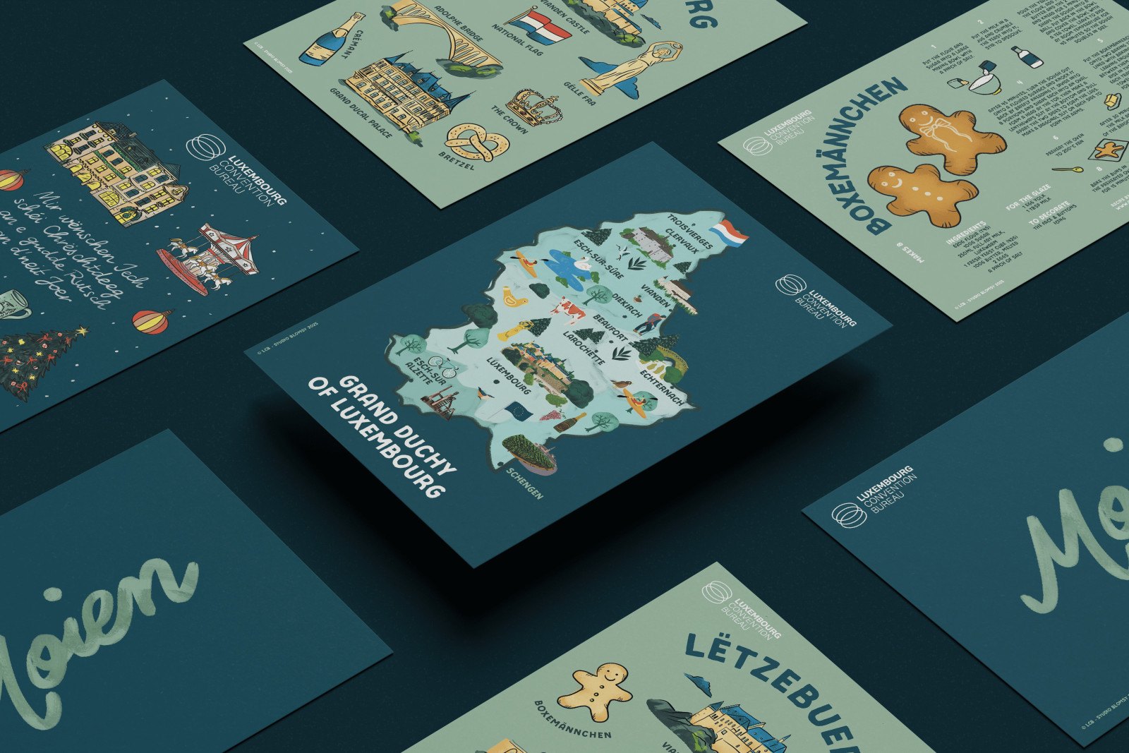 Dans un second temps, le Luxembourg Convention Bureau nous a confié la réalisation d’une carte de Noël, développée dans le prolongement direct de l’univers graphique créé pour le salon.
